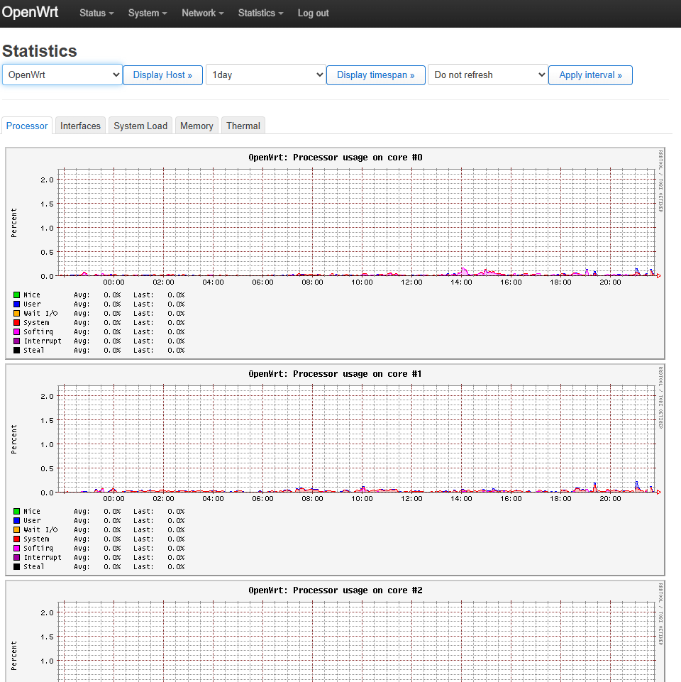 luci-app-statisticsとcollectdを入れて下図のように各メトリクスのグラフを見れるようにした。collectdは、システム情報を定期的に収集し、さまざまな方法で値を格納するメカニズムを提供する小さなデーモンで、luci-app-statisticsはそれをLuCI上に表示するためのものっぽい。