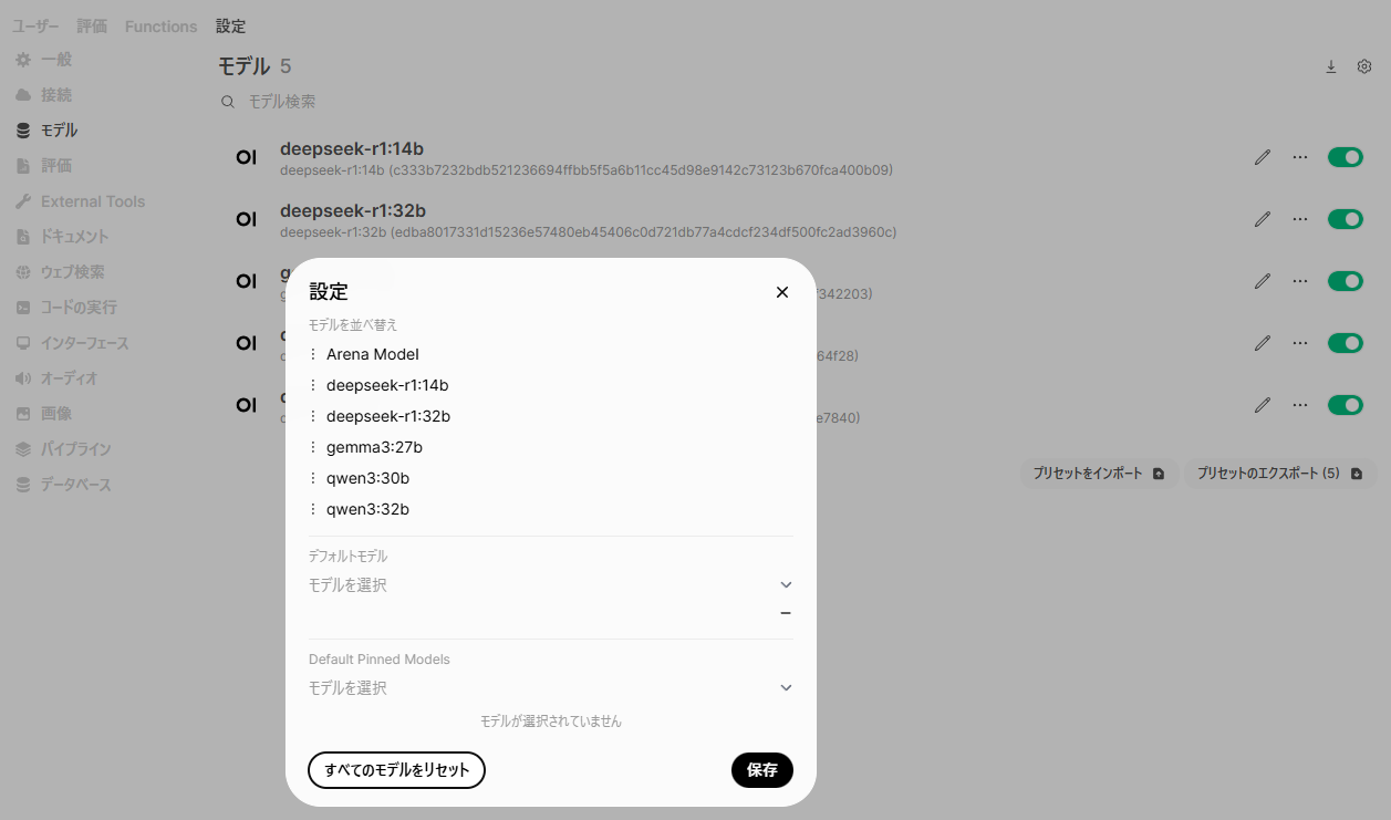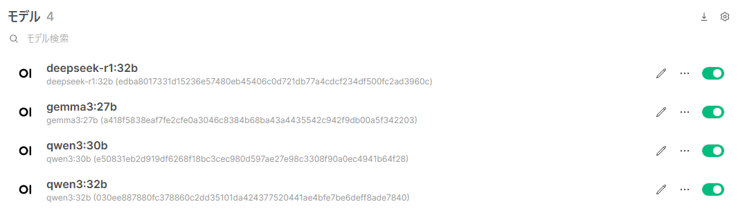 この状態でdeepseek-r1:14bを入れるとdeepseek-r1:32bが出てきたりする。