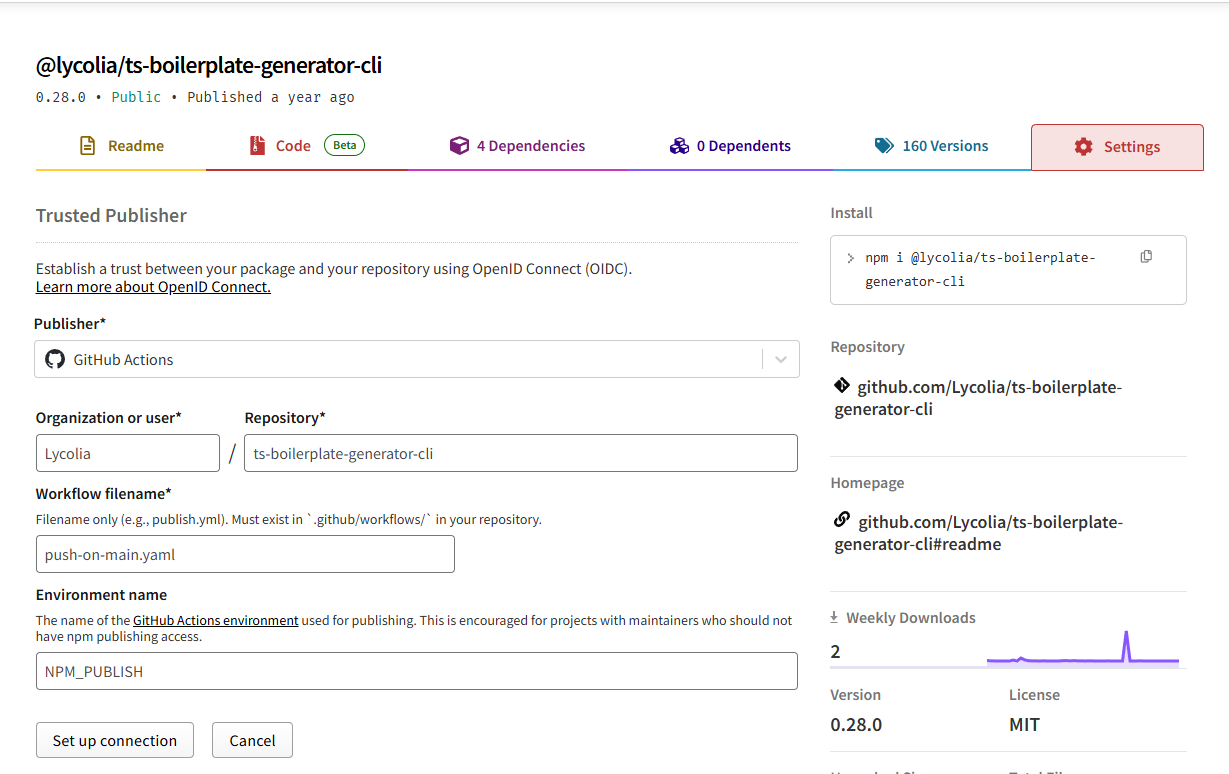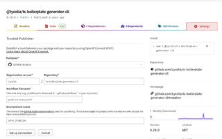 - パッケージのSettingsタブを開き、Trusted publisherにリポジトリ情報を登録する