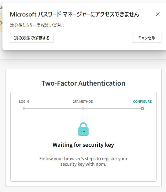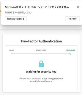 - npmjsに2FA登録する。要パスキー