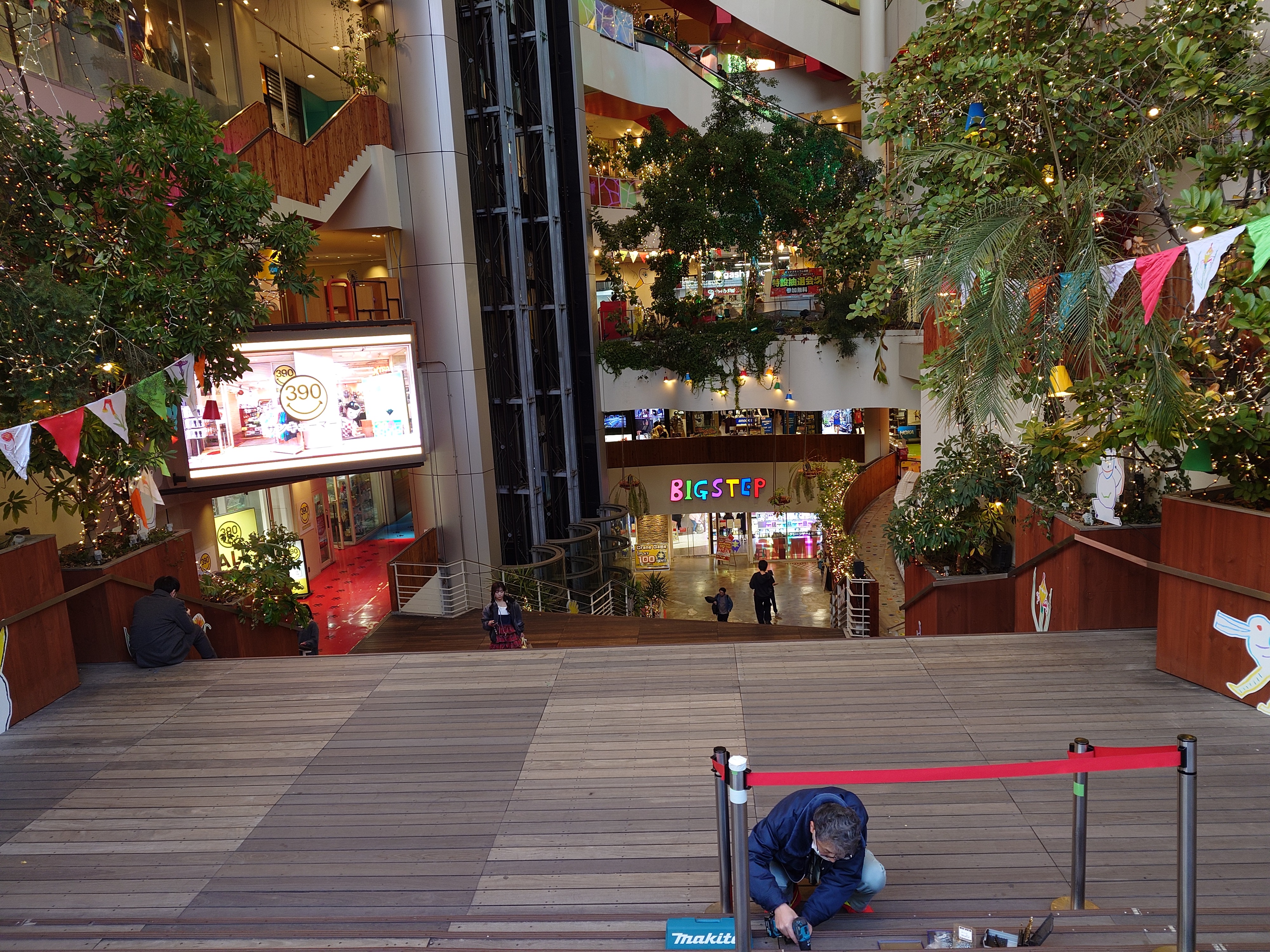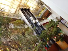 そしてこれが映画館の入る心斎橋ビッグステップなるビルだ。OSシネマズの上映前のau割の宣伝にいる鳥みたいなやつがいるし、全体的にポップな感じかと思えば、緑が豊かで、カッコいい感じのゴンドラむき出しエレベーターが三基も並んで動いていた。