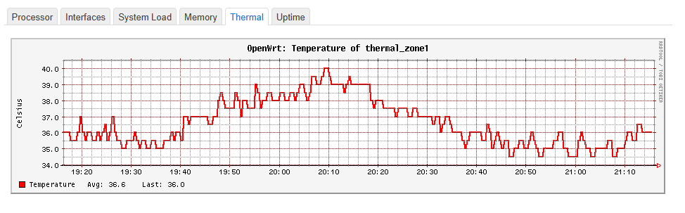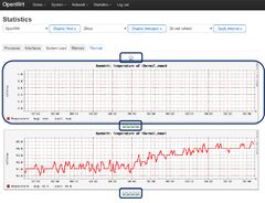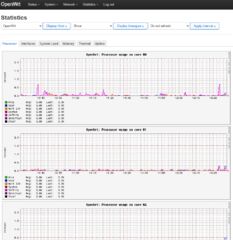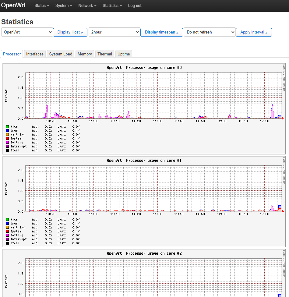 luci-app-statisticsとcollectdを入れて下図のように各メトリクスのグラフを見れるようにした。collectdは、システム情報を定期的に収集し、さまざまな方法で値を格納するメカニズムを提供する小さなデーモンで、luci-app-statisticsはそれをLuCI上に表示するためのものっぽい。