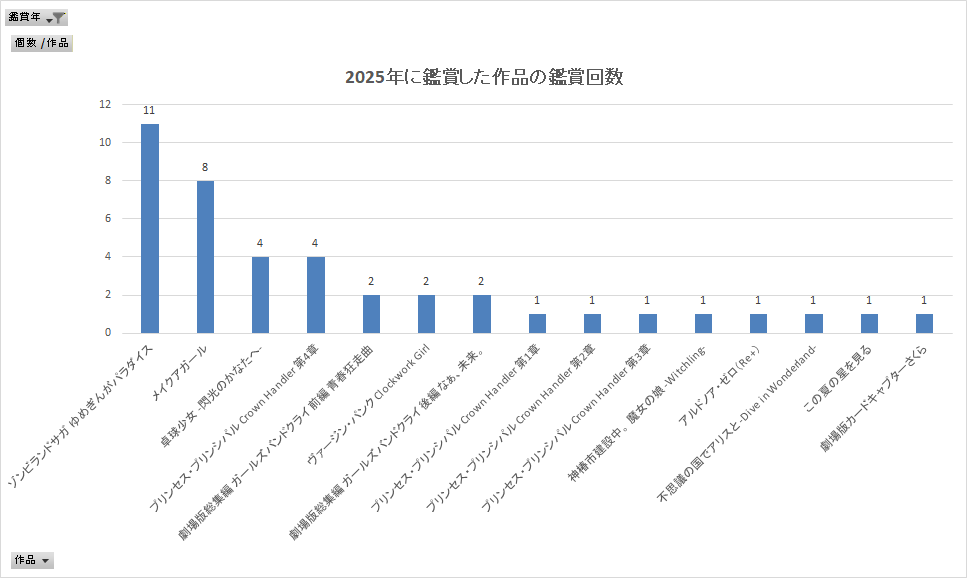 2024年はアニメ映画18作、実写映画1作を観たのに対し、今年はアニメ映画14作、実写1作で、しかもプリプリ1~3章に至ってはリバイバル公開なので、今年公開された作品だけに限ると11作しかない。このため作品数に対しての鑑賞回数が多く、ヘビロテ気味だ。