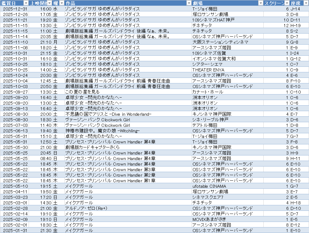 今年はこれまでの年の中で唯一、1~12月まで全ての月で映画館に訪れており、中々珍しい年となった。半面で年の後半に食指が伸びる作品が少なく、リアルの都合や、鑑賞時の縛りの都合もあり、どうにも伸びが悪かった。鑑賞時の縛りというのは今年最も鑑賞した「ゾンビランドサガ ゆめぎんがパラダイス」は一度見た映画館では鑑賞しないということにしていたため、ヘビロテにかなり支障が出た部分がある。