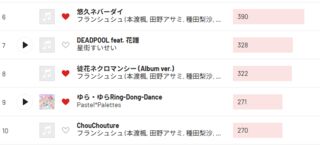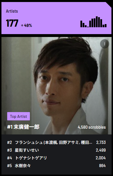 二位はなんとフランシュシュ。フランシュシュの曲を聞き始めたのはゾンビランドサガ ゆめぎんがパラダイスの鑑賞後、それも10/29が恐らく最初の聴取だったと思われるため、僅か二ヵ月で2025年で最も聴いたボーカルアーティストとなった。驚きである。