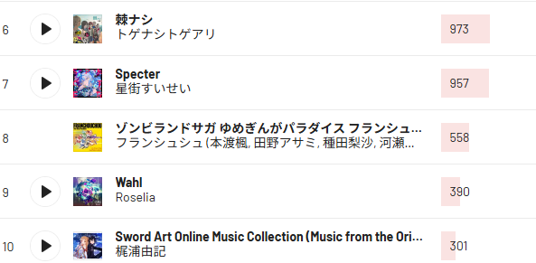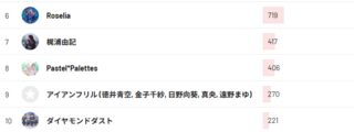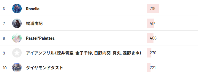 6~10位はRoselia、梶浦由記、パスパレという、こちらもロングテール枠に入ろうとしているミドルテールくらいのアーティストが多かった。その他は全般的にガルクラ組が多い感じだ。