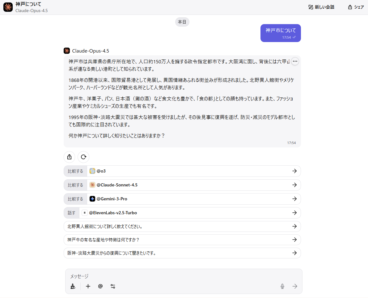 様々なモデルを使える強みとして、チャットUI上でほかのモデルとの出力比較機能を備えていたり、途中でモデルをスイッチすることもできる。これを一つのサービス上で行えるのはユースケース次第ではコストパフォーマンスがいいだろう。