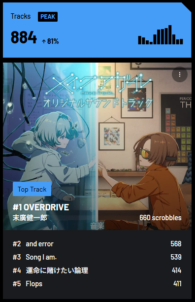 メイクアガールOST、星街すいせい、ゾンビランドサガ リベンジ、ガルクラ、ゾンビランドサガ無印みたいな感じの流れになった。概ねアーティストとリンクしてる感じ。