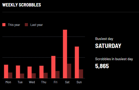 ウィークリーでは土曜日が最多となった。2025年のすべての土曜日の合算では5,865回聴取したようだ。昨年と比べるとかなり聴いた回数が伸びている。
