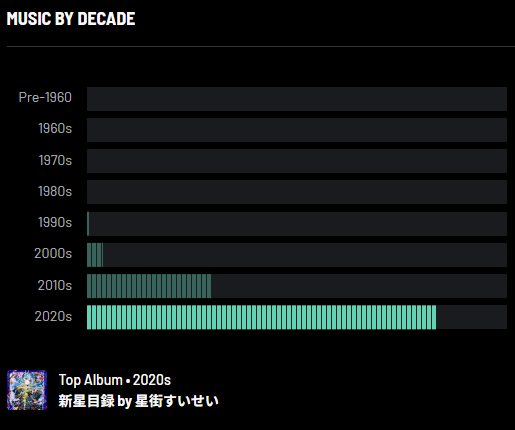 年代としては2020年代の曲が主体で、2010年代はガクッと下がり、2000年代はもっと…みたいな感じだったようだ。