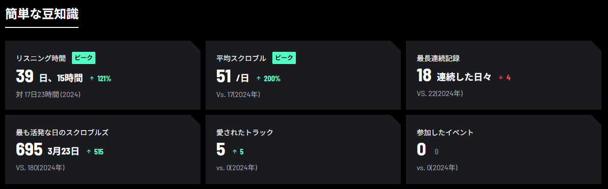最後に、2025年全体を通した再生時間は39日と15時間で昨年比121%上昇、一日当たりの平均再生回数は51回、連続聴取日数は18日で昨年比-4日、最多再生は3/23の695回で昨年比515回上昇、お気に入りにした曲は5曲で昨年比5上昇なので、昨年はお気に入りにした曲がなかったようだ。