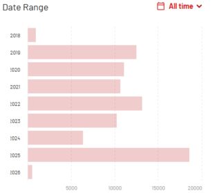 このグラフは2019~2025年の積み上げなので、前年以前のデータもすべて含まれている。なお2025年はまだ終わっていないので本日時点のデータだ。