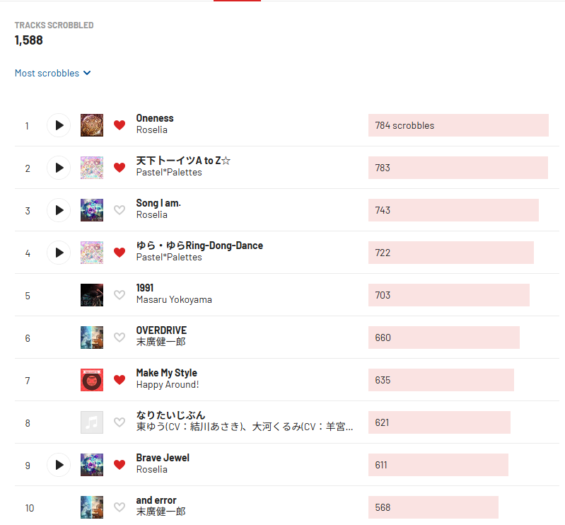ヘビロテ鑑賞作品一覧ともいえるグラフ。やはりトラペジウムは狂気に染まりきっている。これを超える作品は出ないと思う。